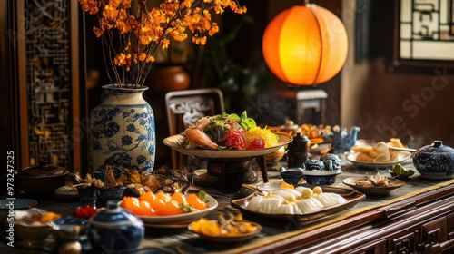 dinner, table, festival, traditional, dish, vibrant, arrangement, food, celebration, lantern, floral, decor, chinese, cookery, festive, epicure, banquet, autumn, seasonal, gathering, culture, hospitality, delicacy, presentation