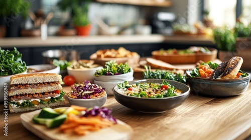 A beautifully arranged display of various vegan and gluten-free dishes showcases fresh, wholesome ingredients in a warm kitchen, perfect for health-conscious dining