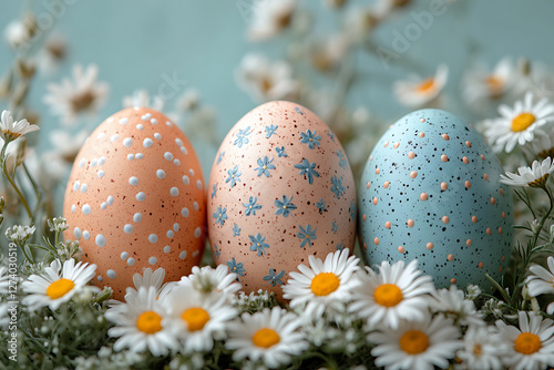 A beautifully arranged Easter composition featuring pastel-colored eggs decorated with intricate floral patterns, accompanied by fresh flowers against a soft pastel background