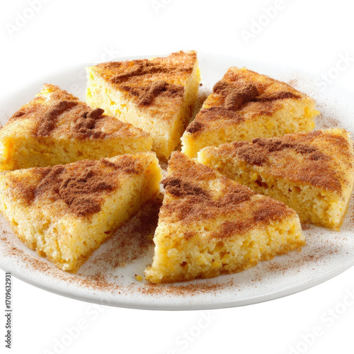 A beautifully arranged plate of golden cornbread slices dusted with cinnamon, showcasing a delicious dessert perfect for gatherings or family meals, with a soft texture and inviting aroma