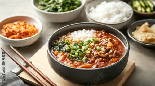 A beautifully arranged table setting featuring bowls of hot rice soup, colorful side dishes, and chopsticks, inviting family and friends to share a meal.