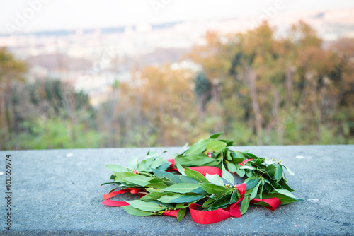 A beautifully arranged wreath of green leaves adorned with a red ribbon