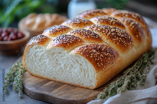 bread, loaf, sesame, baking, food, pastry, kitchen, ingredient, texture, crust, slice, fresh, homemade, aroma, gold, soft, fluffy, culinary, meal, snack, breakfast, brunch, nourishment, healthy, grain, wheat, artisan, receipe, delicious, feast, table, rustic, wood, decor, natural, harvest, warmth, comfort, sharing, culture, tradition, enjoyment, hospitality, favor, creativity