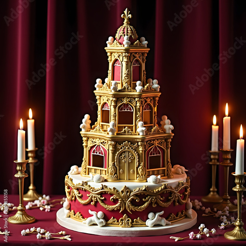 a beautifully crafted cake designed like an ornate palace features multiple tiers, adorned with white figurines, red and gold accents, and surrounded by candles and delicate flowers