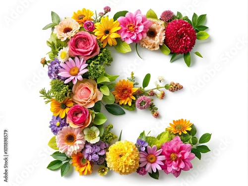 A beautifully crafted letter E adorned with vibrant blossoms and lush greenery, perfect for enhancing creative projects and designs with an elegant floral touch.