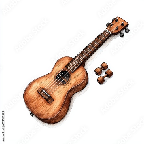 A beautifully crafted wooden ukulele paired with small wooden weights, ideal for music and fitness themes.