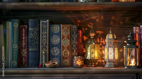 A beautifully decorated bookshelf with Ramazan-themed books, decorative items, and a soft glow from a nearby lantern