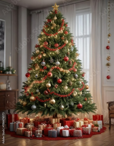 A beautifully decorated Christmas tree with ornaments and garlands , Festive decor, Ornaments