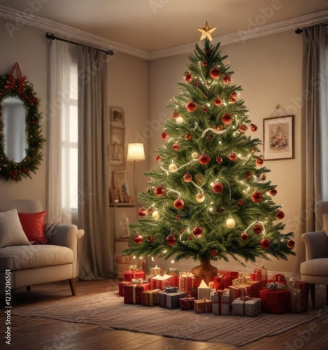 A beautifully decorated Christmas tree with ornaments and lights in a cozy living room , lighting, interior