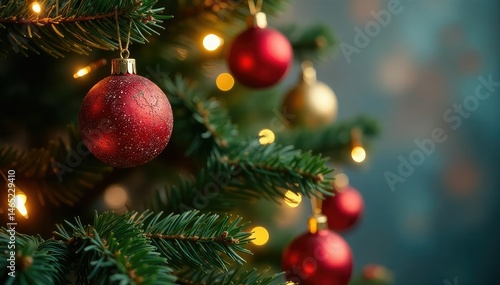 A beautifully decorated Christmas tree with ornaments and twinkling lights, festive and joyful , gold, season, gift