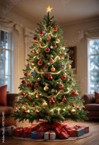A beautifully decorated Christmas tree with ornaments, colorful ornaments, glittering garland