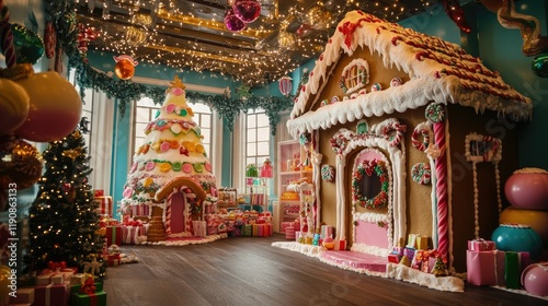 A beautifully decorated gingerbread house with colorful icing, candy decorations, and a festive atmosphere, perfect for Christmas-themed photo shoots