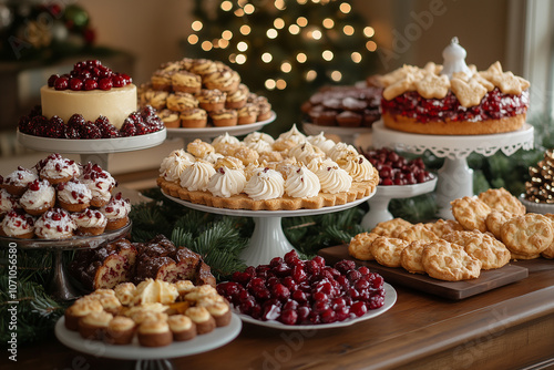 A beautifully decorated holiday table with a variety of delectable desserts and festive decor in a cozy setting with a Christmas tree