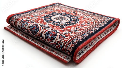 A beautifully designed prayer mat with geometric patterns, folded neatly, isolated on a white background
