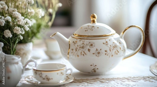 A beautifully designed white teapot and matching creamer with gold accents and floral patterns, set against a minimalist table setting.