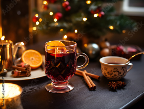 A beautifully garnished cup of mulled wine, complete with an orange slice, cinnamon, and star anise, sits on a rustic table set against a warm, festive backdrop. Perfect for holiday celebrations.