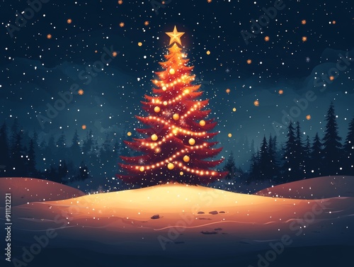 A beautifully illuminated Christmas tree in a snowy landscape, creating a magical holiday atmosphere with falling snow.