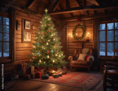 A beautifully lit Christmas tree in a cozy cabin with multicolored lights and ornaments that create a warm and inviting glow, comfortable seating, twinkling lights