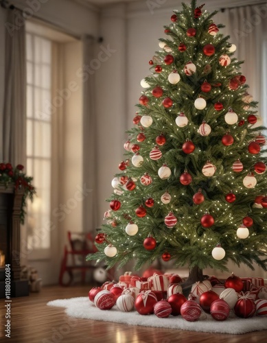 A beautifully lit Christmas tree with red and white ornaments and greenery, winter wonderland, warm glow
