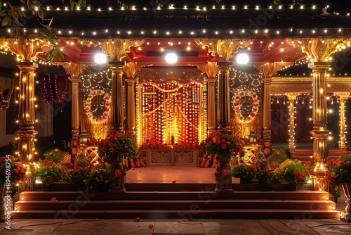 A beautifully lit Navaratri stage with traditional decorations, lights, and flower arrangements, ready for the festivities.