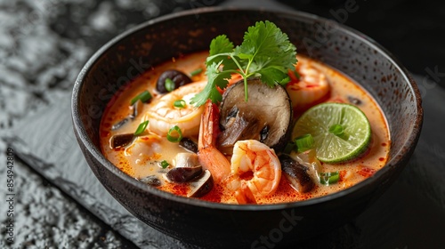 A beautifully plated Tom Yum soup with shrimp, mushrooms, and fresh lime slices, enveloped in a fragrant coconut milk broth. The bowl sits on a black stone surface, and the rich colors of the