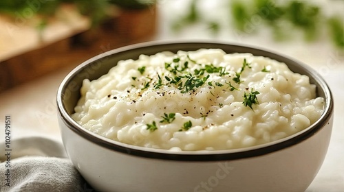 A beautifully presented bowl of creamy risotto garnished with fresh herbs, set against a soft, blurred background, creating ample copy space for branding or promotional text.