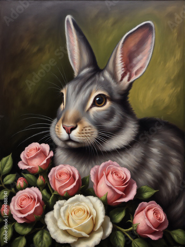 A beautifully rendered portrait of a gray rabbit surrounded by a bouquet of soft, pastel roses, blending realism with a touch of whimsy.