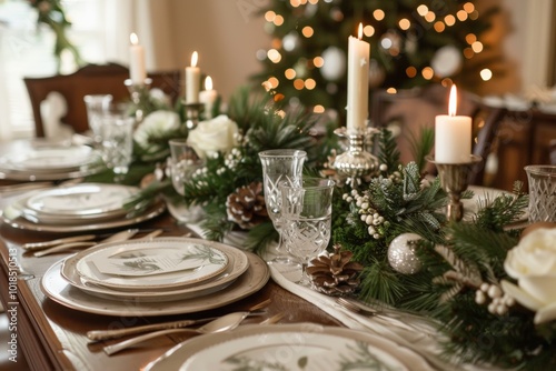 A beautifully set holiday dining table with candles, pinecones, and festive decorations, perfect for a warm and elegant holiday dinner.