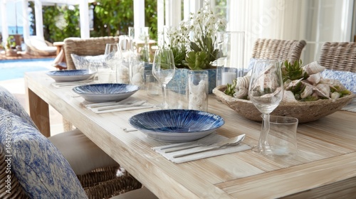table setting, glassware, swimming pool, elegant, place setting, poolside, tableware, dining table, centrepiece, beach house, fine dining, relaxing, vacation, holiday, resort, tropical, seashell, candle, succulent, flower, wine glass, cutlery, napkin, wooden table, natural light, sunny day, garden, patio, terrace, deck, gazebo, ocean view, tranquil, serene, stylish, chic, modern, contemporary