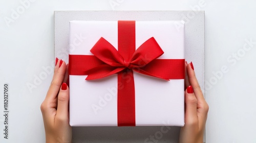 A beautifully wrapped gift box with a red ribbon held by two hands, symbolizing celebration and thoughtfulness.