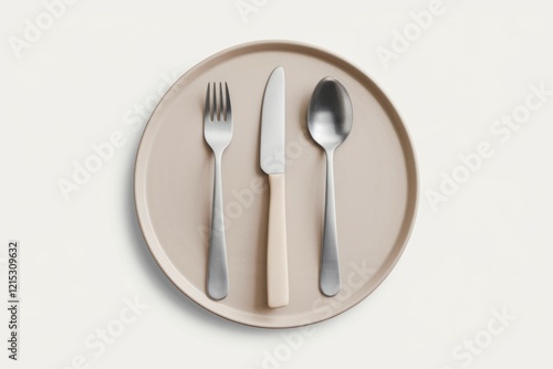 A beige plate with a fork, knife, and spoon, minimalist setting.
