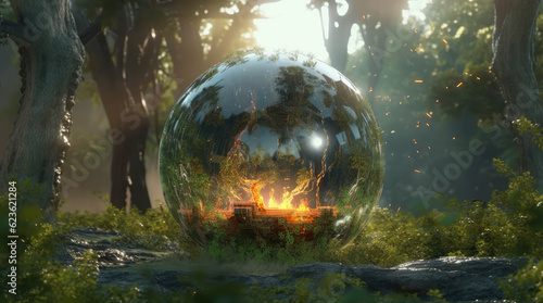 a big crystal ball full of green trees with nature and life inside the crystal vola, in the middle of a post-apocalyptic burning world, 4k, qhd, hyper-realistic, full of details