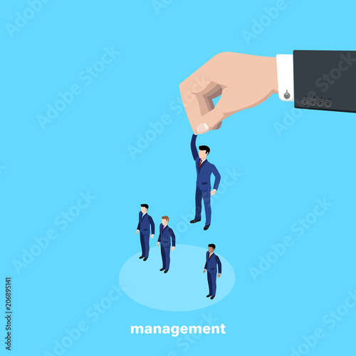 a big hand holds a man in a business suit by the hand on the weight, an isometric image