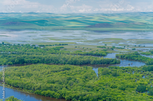 A big wetland on Hulunbuir Grasslands, Inner Mongolia, China.