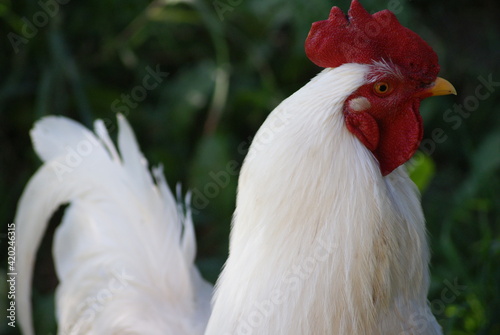 chicken, rooster, bird, animal, farm, hen, poultry, cockerel, white, beak, nature, agriculture, fowl, feather, red, feather, domestic, grass, comb, animal, green, rural, bantam, farm animal, beautiful