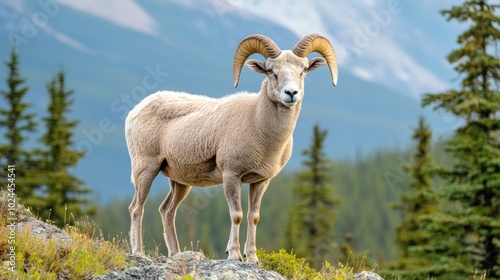 A bighorn sheep stands on a rocky outcrop in a mountain meadow