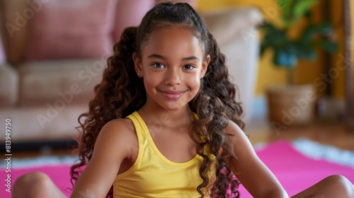 A biracial girl with curly hair sitting and smiling in a brightly colored room, wearing a yellow tank top.