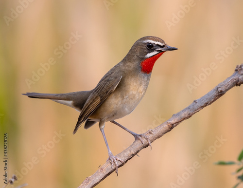 A bird (Siberian Rubythroat) perched on the sticky wood in nature