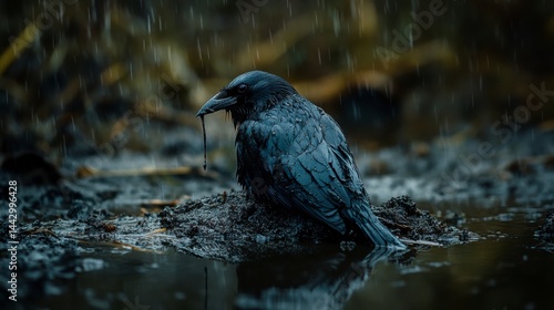 crow, rain, bird, dark, wet, oil, pollution, environmental, wildlife, nature, animal, black, water, mud, ground, gloomy, sad, soaked, feather, wing, beak, head, body, still, heavy, atmosphere, serious, photo, portrait, close, up, detail, texture, background, environment, problem, issue, impact, consequence, damage