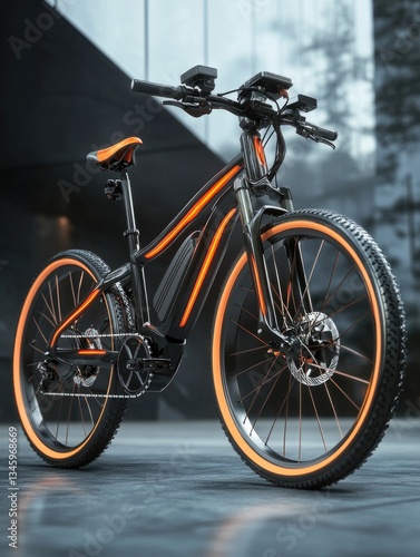 bike, cycle, vehicle, transportation, building, architecture, city landscape, urban, orange, black, wheel, frame, seat, handlebar, parking, space