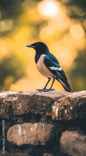 A black and white bird perched on a stone wall, sunlit background.