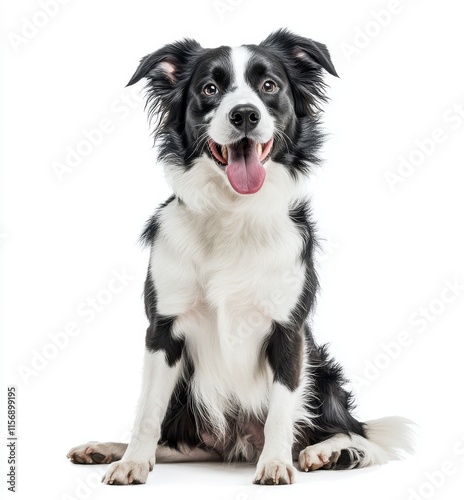 A black and white border collie sits in front of a white background