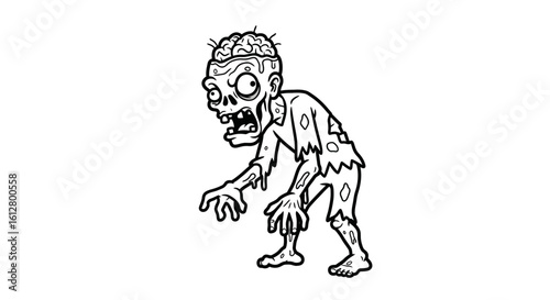 A black and white cartoon illustration of a classic zombie monster with a spooky expression and an exposed brain.