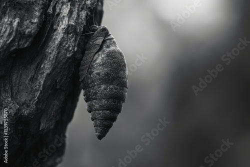 A black and white close-up of a pupa clinging to a tree trunk, signifying transformation.