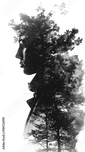 A black and white double exposure portrait that merges a person with trees