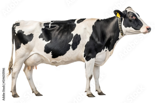 A black and white Holstein cow stands isolated, a dairy animal against a stark white backdrop