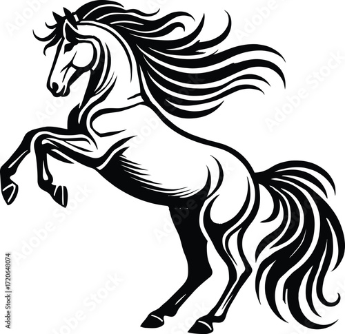 A black and white illustration of a majestic horse with flowing mane, elegant silhouette, dramatic poses, digital art, intricate details, minimalist design, high contrast, vector graphics