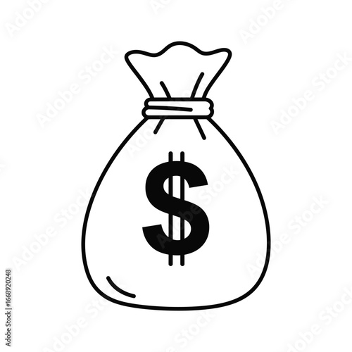 money, bag, dollar, cash, finance, wealth, icon, illustration, graphic, symbol, currency, money bag, savings, investment, profit, earning, income, revenue, capital, funds, asset, black, white, line, art, simple, minimalist, style, vector, signs, logotype, mark, label, tags, indicator, representation, dollar sign
