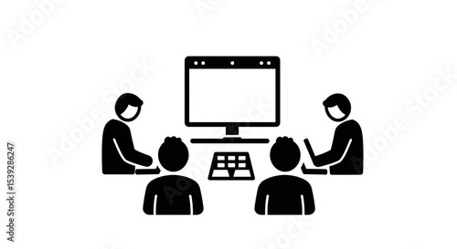 meeting, computer, keyboard, people, illustration, black, white, icon, monitor, screen, team, collaboration, business, office, work, technology, digital, design, graphic, symbol, silhouette, group, flat, style, corporate, communication, discussion, presentation, workspace, desk, table, conference, seminar, training, education, learning, development, planning, strategy, project, management, analysis, review, report, datum, information, network, cyberspace, online