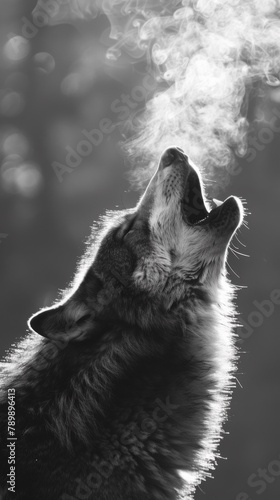 A black and white photo of a howling wolf